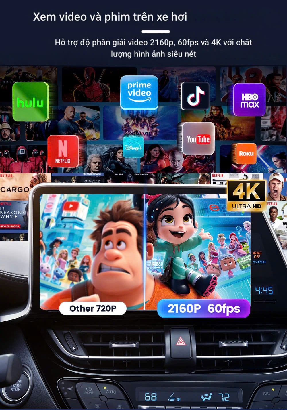 Thiết bị phù hợp cho mọi nhu cầu: xem YouTube, bản đồ dẫn đường, Netflix, nghe nhạc, xem phim, định vị, đa nhiệm…, tất cả ngay trên màn hình zin theo xe – hoàn toàn KHÔNG cần độ chế.