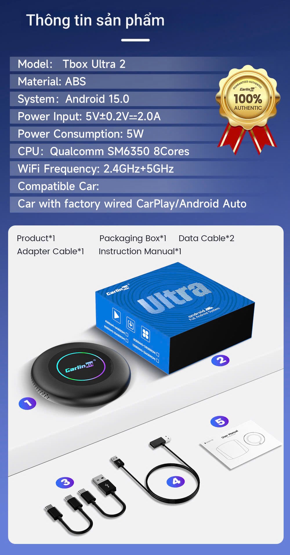 Carlinkit TBox Ultra 2 là phiên bản nâng cấp mạnh mẽ nhất của dòng Android AI Box dành cho ô tô năm 2025. Sở hữu hệ điều hành Android 15, chip Qualcomm SM6350 mạnh mẽ, hỗ trợ Wireless CarPlay – Wireless Android Auto, trang bị khe SIM 4G, bộ nhớ lớn 8GB RAM – 128GB ROM, TBox Ultra 2 mang đến trải nghiệm Android 15 mượt mà ổn định.