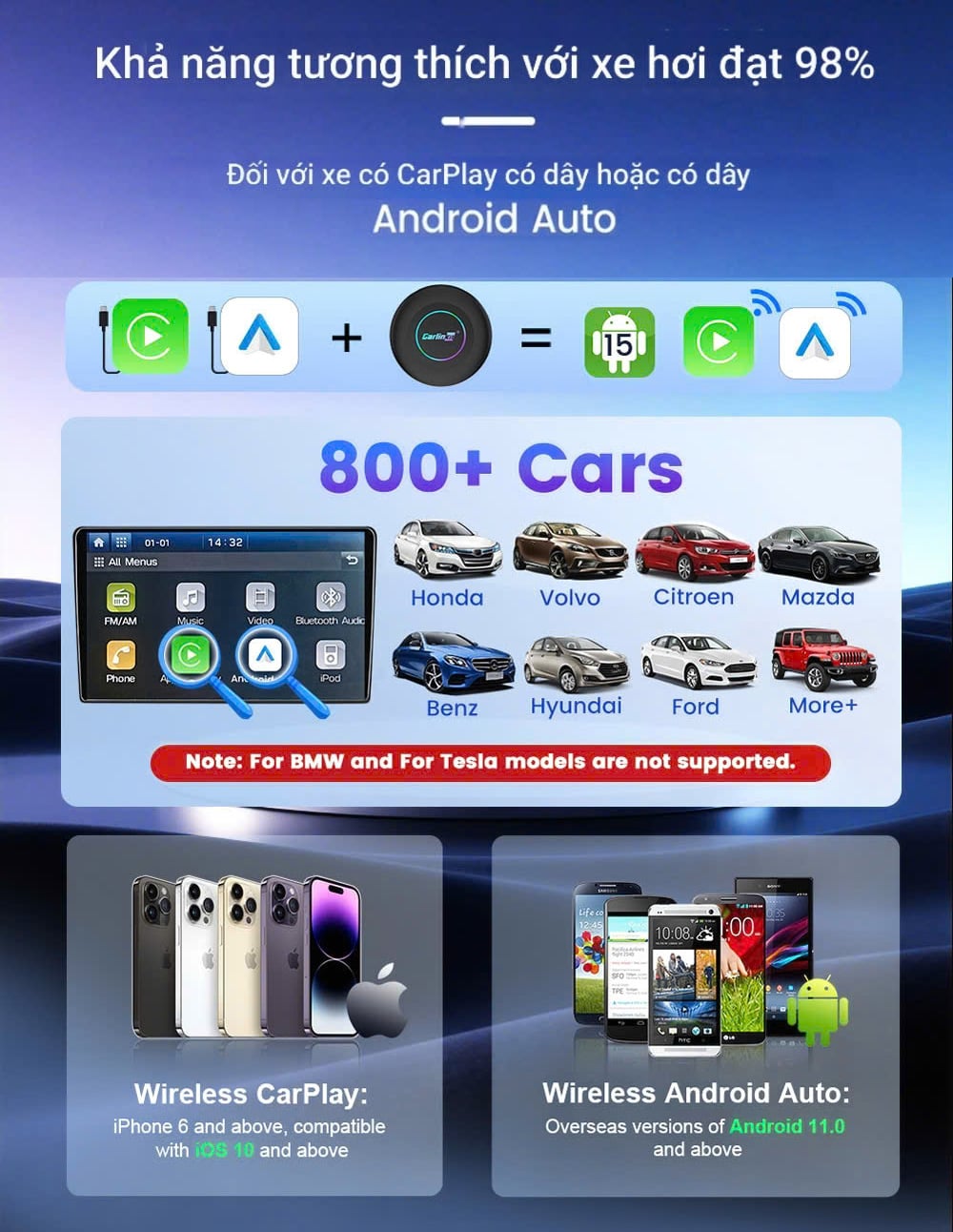 | Tương thích | Xe có sẵn Wired CarPlay hoặc Wired Android Auto |